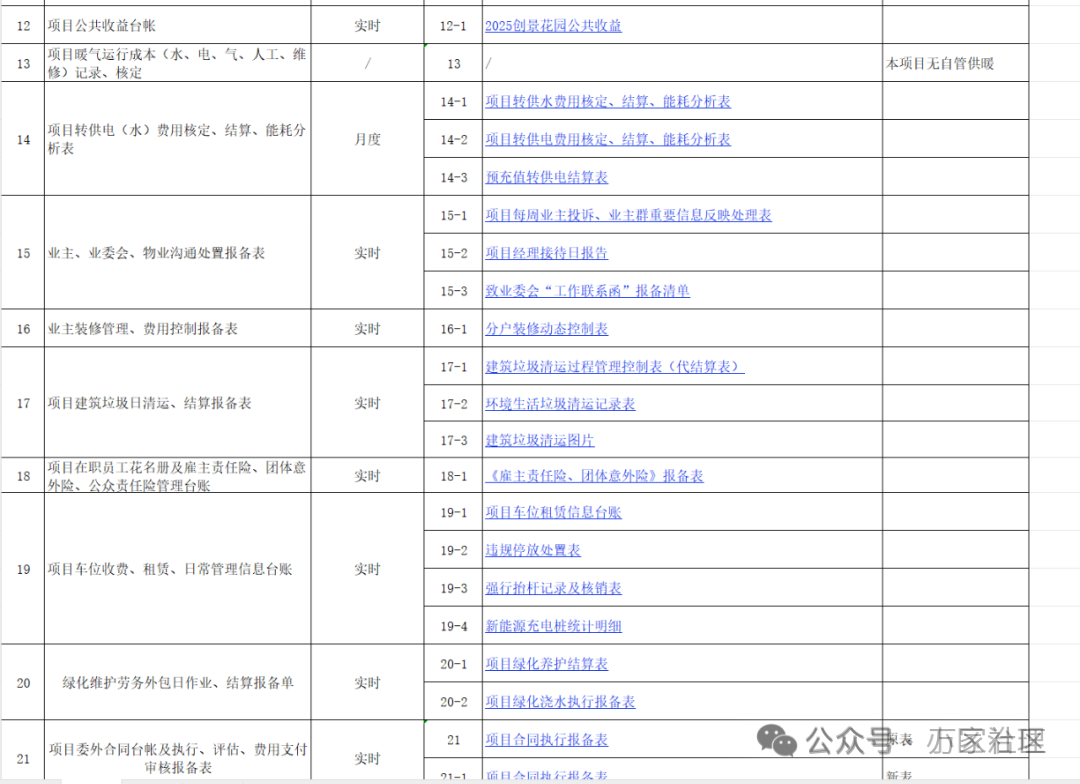 该平台涵盖28个具体项目,随时可以调阅,比如项目年度履约报告(月度);项目年度工作计划及预算核定表(年度);项目资金收支报备审核表(实时);项目财务报表(月度)、质量运行(成本)分析报告(季度);物业费收缴渠道服务矛盾化解及沟通报备表(实时)等等。