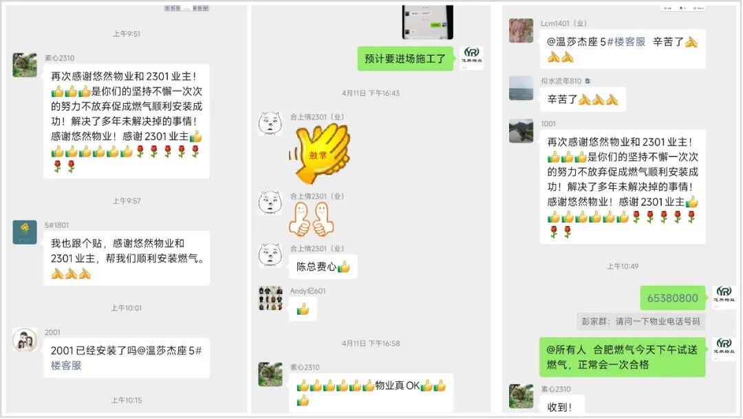 在热心业主王金芝的发动下,5号楼边户业主们安装燃气的积极性被充分调动了起来。随后,悠然物业积极配合推进:组织业主先期登记;与燃气公司沟通,协助收集登记业主信息;以合肥悠然物业服务有限公司瑶海分公司的名义,代表业主向燃气公司提出燃气开通申请;配合燃气公司现场勘察、确定现场施工方案、签订《居民燃气建设安装工程合同书》合同;协调燃气公司进场施工事宜,免费提供施工水电支持;向业主做好安装政策解答、施工安全告知等;对业主不在家的,由物业协助入户施工……